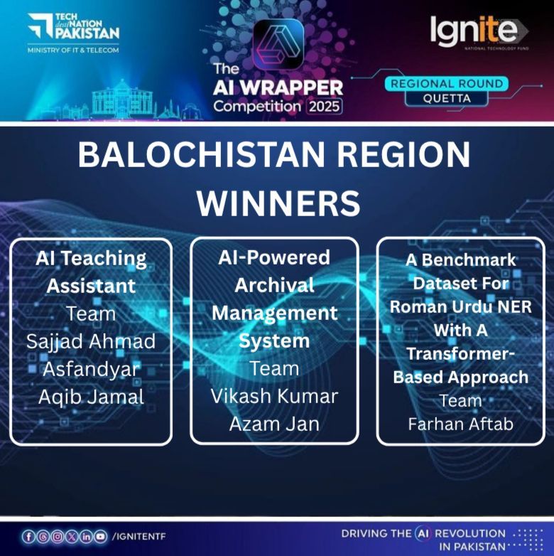 The AI Teaching Assistant was regionally selected in the Pakistan 1st Ignite AI Wrapper Competition 2025, where only three teams were shortlisted to advance to the National Grand Final. Developed under GIL, University of Balochistan, the project qualified in the Ed-Tech track, representing Balochistan at Pakistan’s first National AI Wrapper Grand Final highlighting its innovation, real-world impact, and potential to transform education nationwide.
