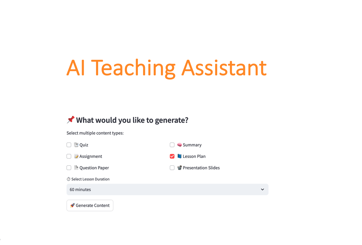The AI Teaching Assistant is a locally developed EdTech application designed to help teachers and parents instantly generate lesson plans, quizzes, assignments, question papers, presentation slides, and topic summaries. Supporting both offline and online modes, the app ensures accessibility, privacy, and scalability across Pakistan and Internationally.